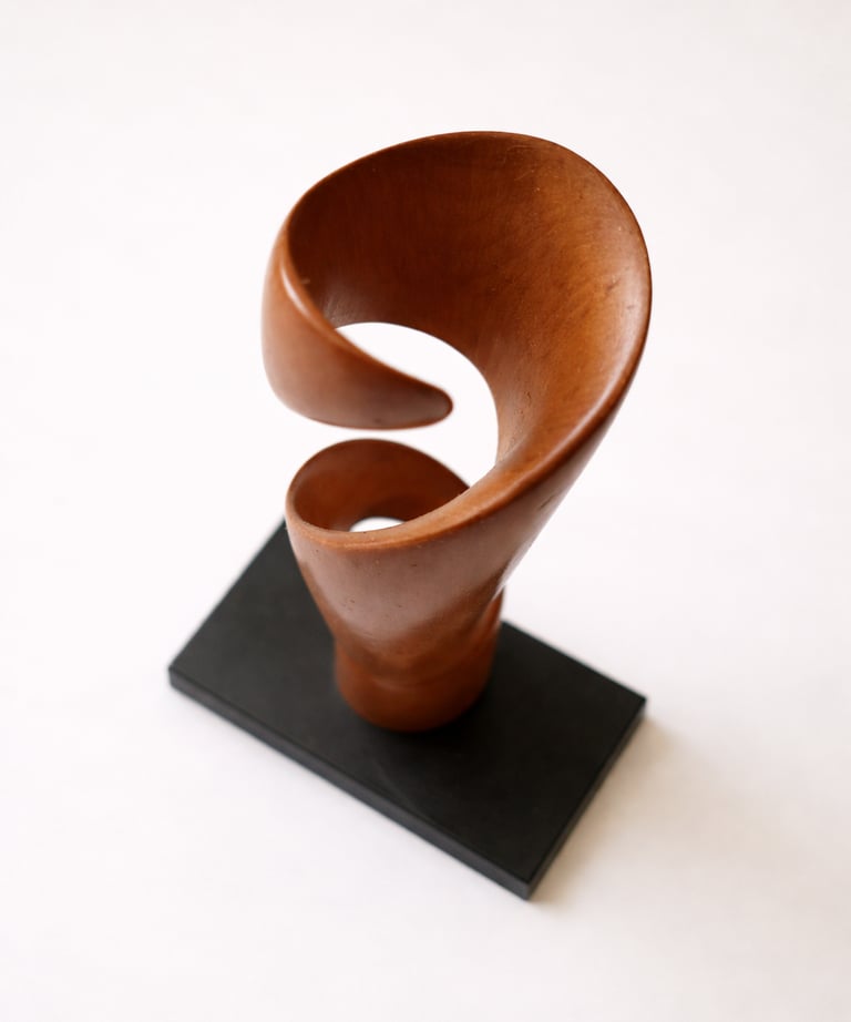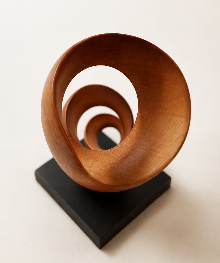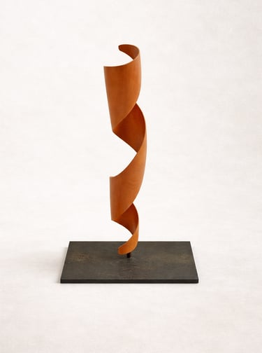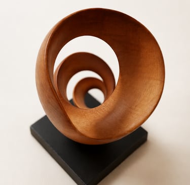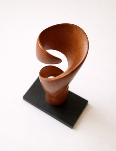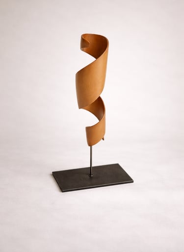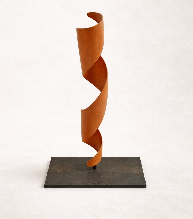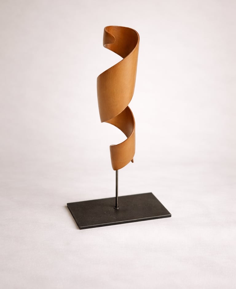 Escultura concebida desde el movimiento ascendente de madera tallada en torsión. La pieza se despliega generando una presencia vertical ligera, donde curva, vacío y ritmo construyen una forma contenida y dinámica.