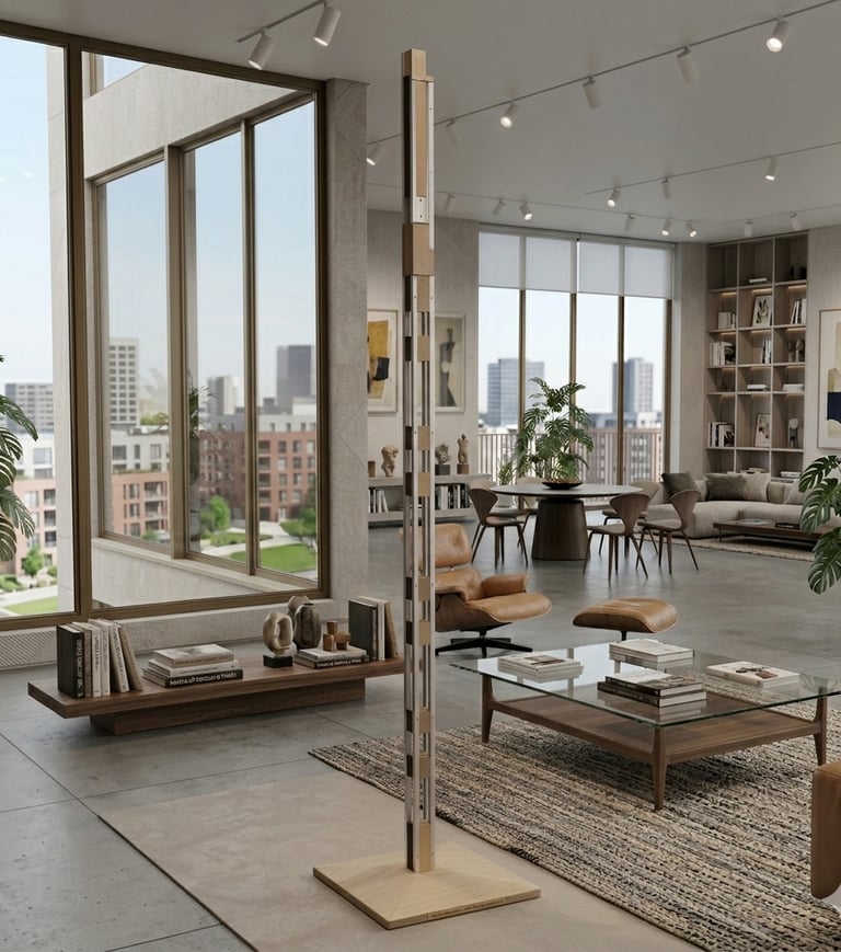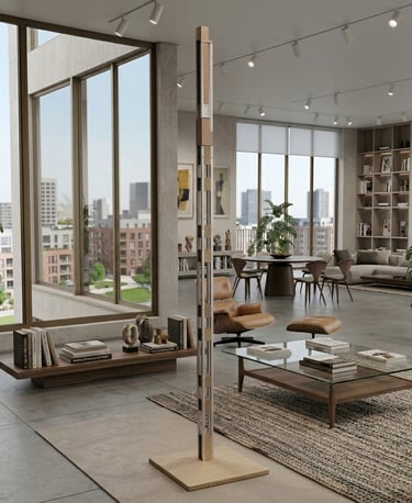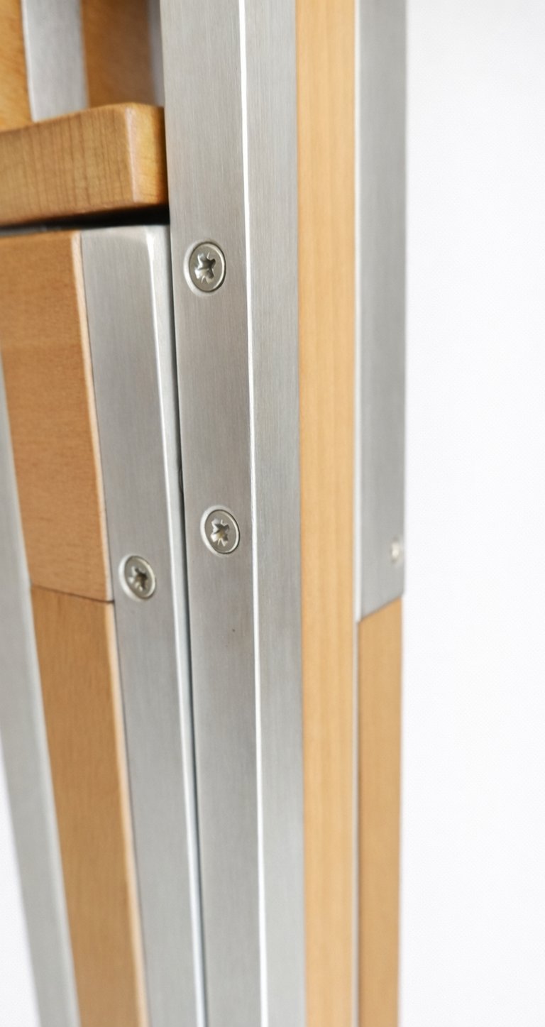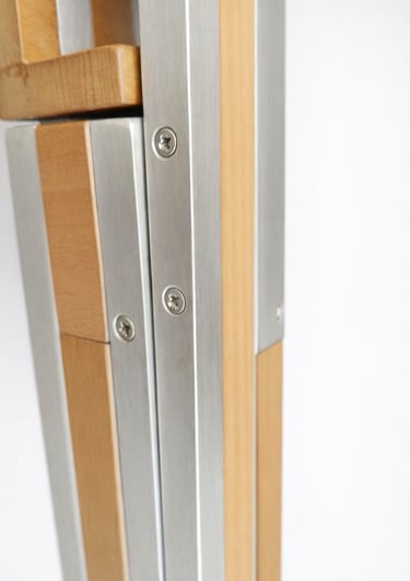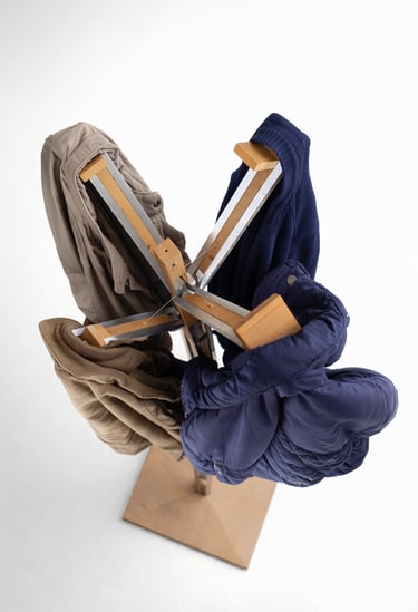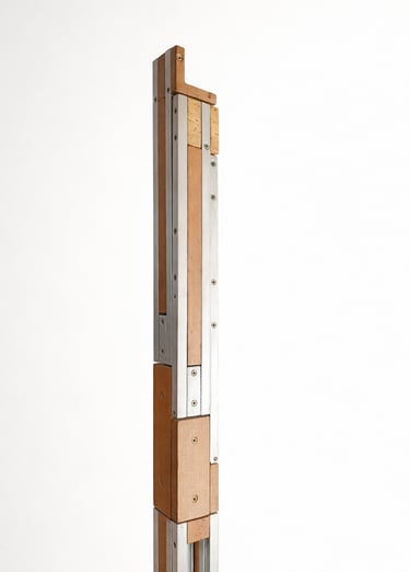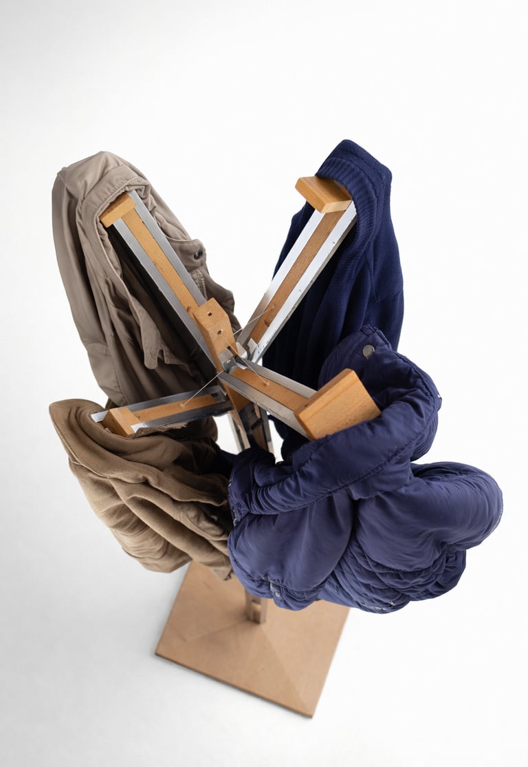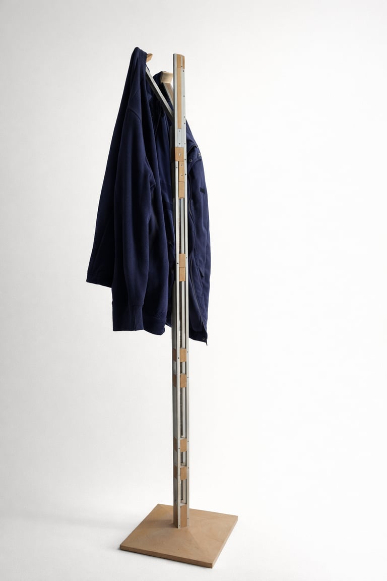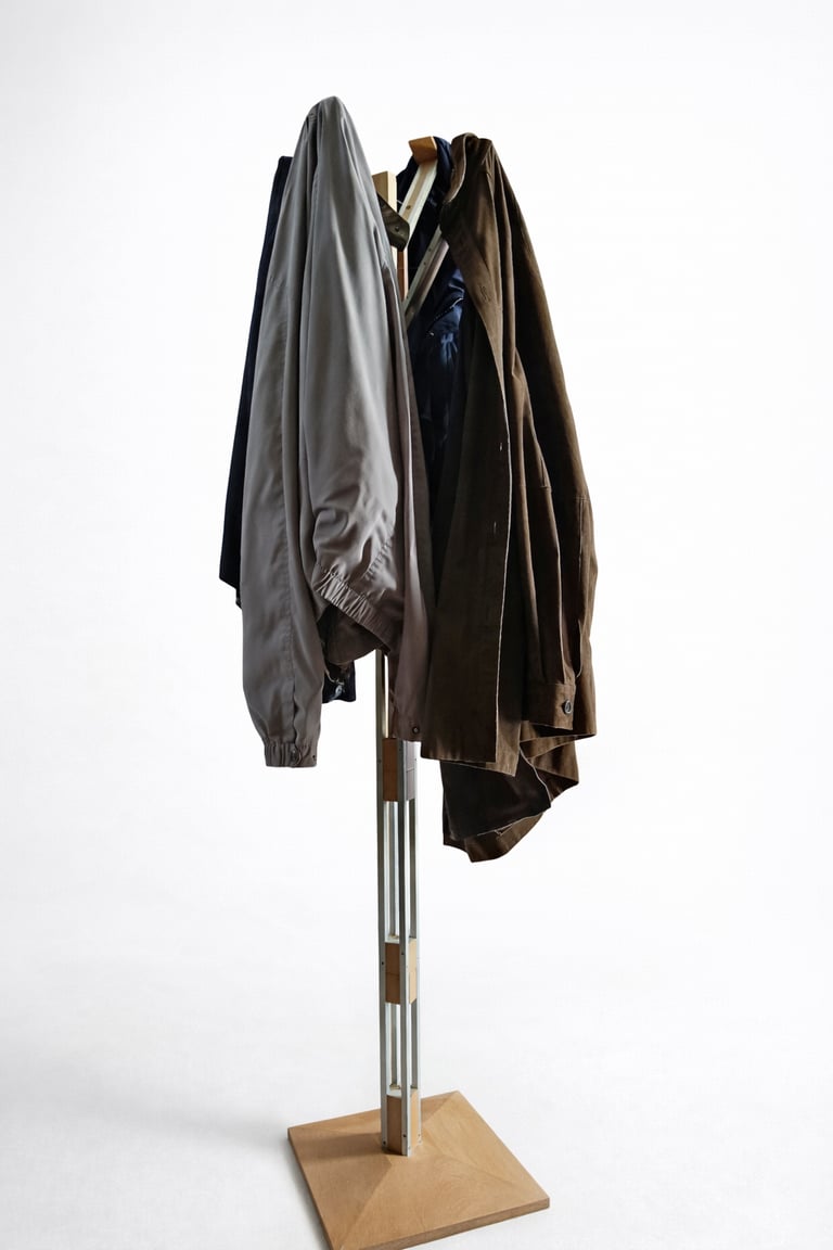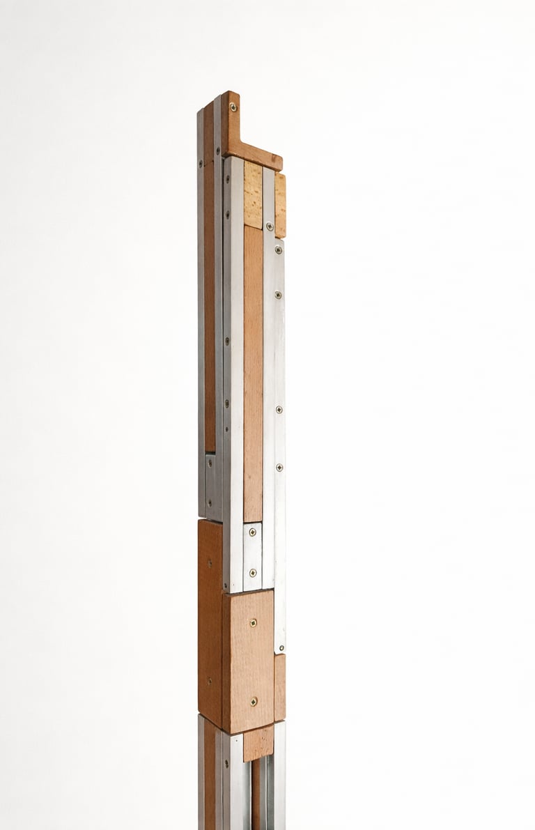 Perchero escultórico que desplaza un objeto de uso cotidiano hacia el territorio de la escultura. La pieza combina madera, y aluminio en una presencia vertical, contenida y precisa, donde función, cuerpo y soporte conviven en un mismo gesto.