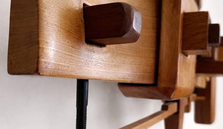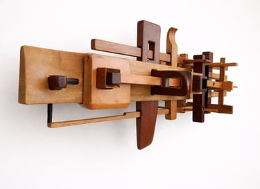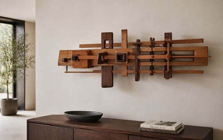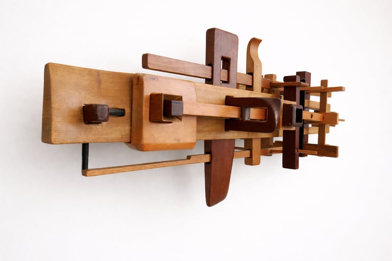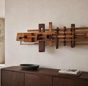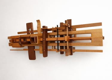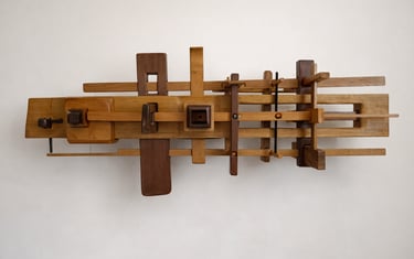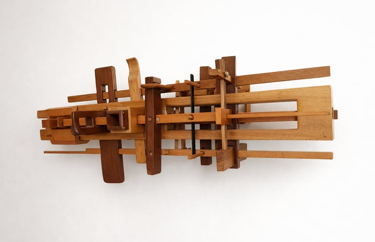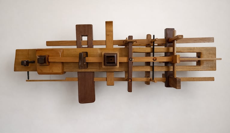 Composición mural concebida desde la superposición, el ensamblaje y la tensión entre dirección, equilibrio y materia. La obra articula