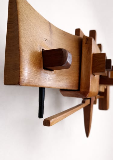 madera y metal en una estructura compleja, de lectura abierta y presencia arquitectónica.